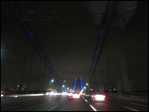 After leaving Hartford we drove through New York City and into New Jersey where we stayed the night in a very luxurious bed for which we were very grateful! It had started to drizzle as we got into New York. The photo below is us crossing the George Washington Bridge which somehow seemed momentous to me, perhaps triggered by a childhood memory. The photo, taken at moving speed and in the dark and rain, is not so memorable. (I also took a couple of the New Jersey industrial areas lit with bright golden glow and smelling just as I remembered from 50+ years ago. Ah, yes, the New Jersey turnpike!)